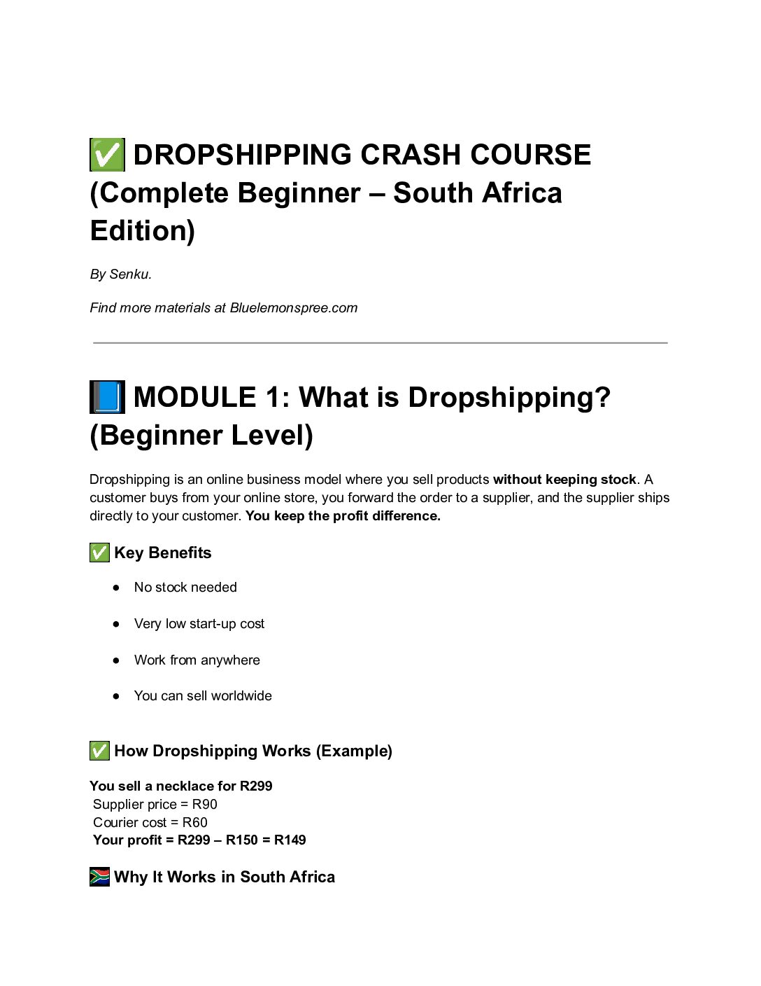 Dropshipping Crash Course: Complete Beginner – South Africa Edition is a simple, practical, step-by-step guide designed to help South Africans launch a profitable dropshipping business — even with zero experience.